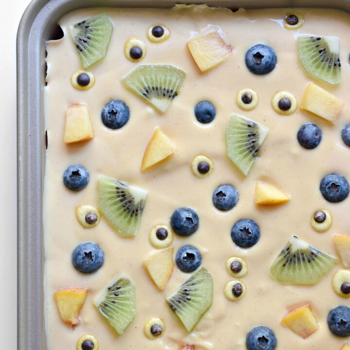 Healthy Halloween Yogurt Bark is solely made from yogurt (with or without dairy!), covered with fresh fruit and lightly sprinkled with homemade monster googly eyes.