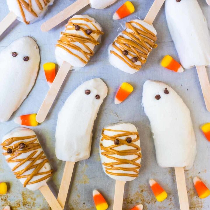 Halloween Banana Popsicles (ghost-shaped frozen banana popsicles and mummy-shaped peanut butter banana popsicles, with mini chocolate chips) are a fun, easy treat to make with kids.