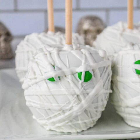 White chocolate Candy apple mummies are so cute and so easy to make. A fun Halloween dessert with fresh fruit inside decorated for the holiday.