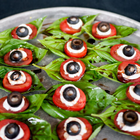 This Halloween Caprese Salad recipe is made with fruity tomatoes and olives. It's super easy, and a great healthy alternative to all of the candy at Halloween parties.