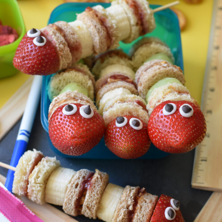 Made with peanut butter sandwiches, bananas, strawberries, and googly eyes, these Snake sandwiches are perfect for a creepy lunchbox treat!