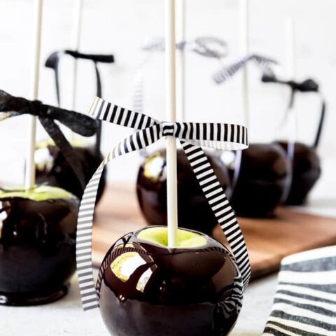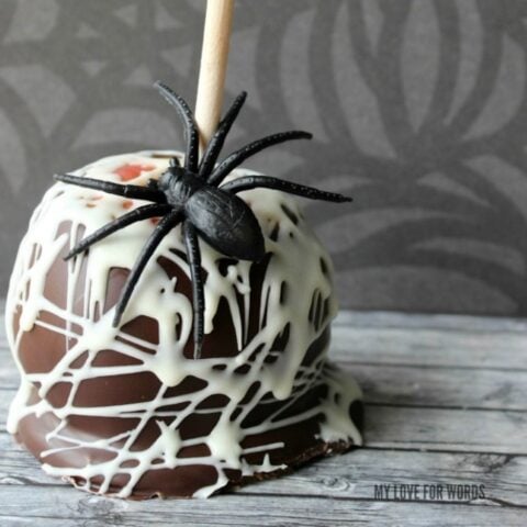 These dark chocolate-coated Spider Web Caramel Apples are so easy to make and perfect for a spooky Halloween Party!
