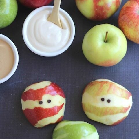 These adorable Apple Mummies are such an easy, healthy Halloween treat! Your little ghosties will gobble them up! A perfect fruit snack for Halloween parties, spook-tacular fruit trays, or a fun October after-school nibble!