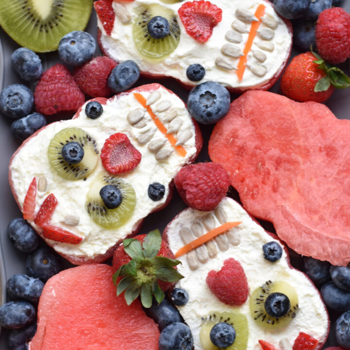 These Refined Sugar-Free Watermelon Skulls are made with watermelon, berries, and homemade dairy-free whipped cream. No sugar ever touches this recipe or your child’s lips!