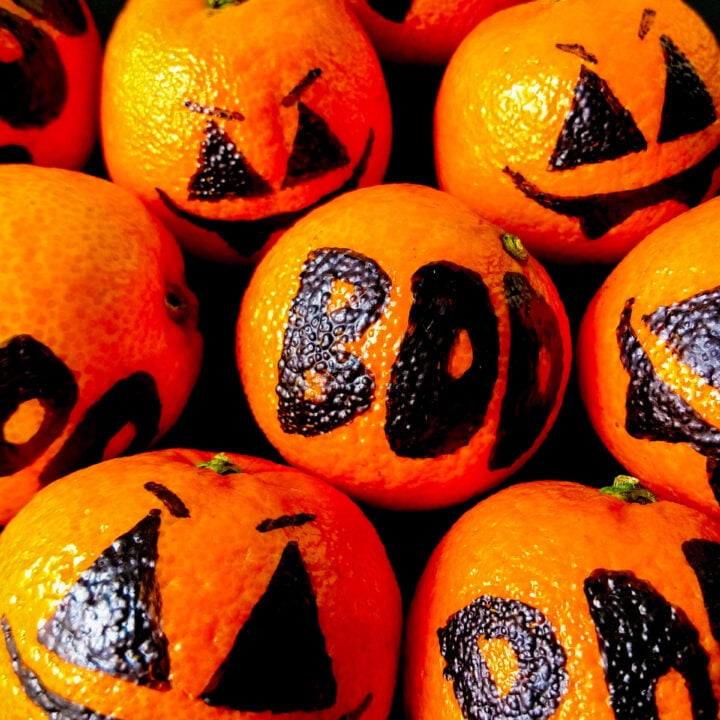 Quick, two-ingredient Clementine Pumpkins are a kid favorite every time! Make them with peeled clementines (or mandarin oranges) or let your imagination run wild and draw a jack-o-lantern face on the clementine skin with a non-toxic marker.