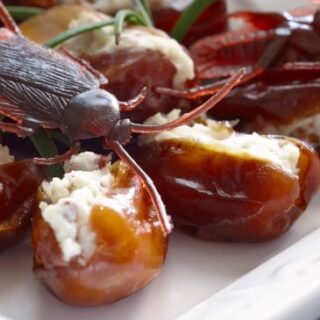 One of the grossest recipes ever that is actually pretty tasty and you should try–because it’s funny and delicious. Plus it’s sure to creep the kids out. It’s Roaches…or Crunchy Cheese-Stuffed Dates.