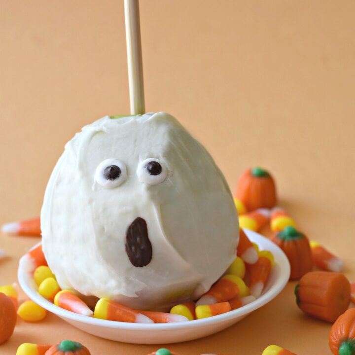 Boo! Dipping apples in white candy gives them a ghostly appearance perfect for Halloween! Make perfect gourmet looking Candy Apple Ghosts in just 3 simple steps.