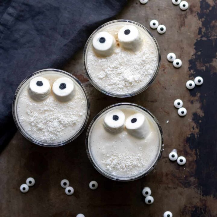 This Ghost Halloween Smoothie recipe is healthier and fun! The banana and coconut smoothie is thick and delicious, then it's topped with shredded coconut and marshmallow 'ghost eyes' for a spooky twist.