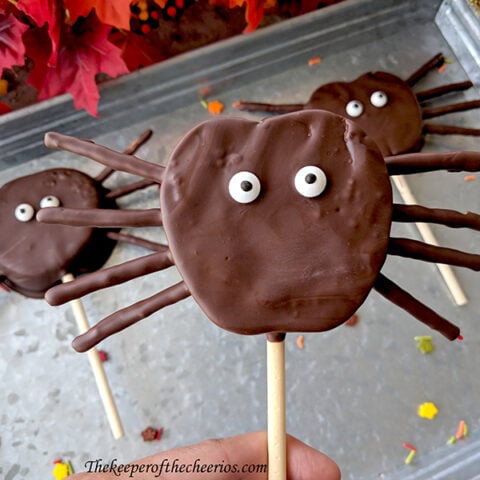 Spider Apple Slices are so easy to throw together! All you need is apples, chocolate, pretzel sticks, candy eyes, and skewers.