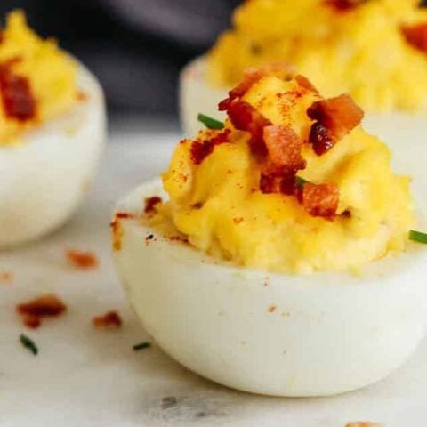 This easy deviled eggs recipe is perfect for making delicious and easy holiday side dishes. You can save some time in the kitchen by prepping these in advance of your party!