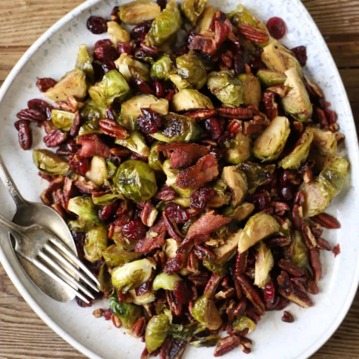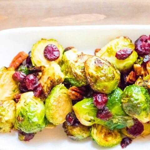 Roasted Brussels Sprouts with Cranberries, Bacon, and Pecans is a festive, vibrant, and delicious holiday side dish for any menu! Sweet, savory, and satisfying- these roasted Brussels sprouts are sure to be a beautiful addition to your holiday table.