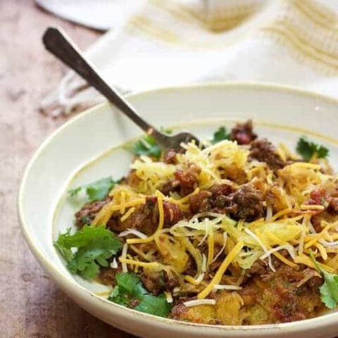 This Mexican noodle dish is made with spaghetti squash and perfectly seasoned ground beef.