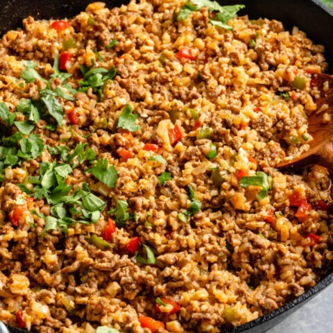 Ready in 30 minutes, this Deconstructed Stuffed Peppers Skillet Recipe is made in one dish making cleanup a breeze.